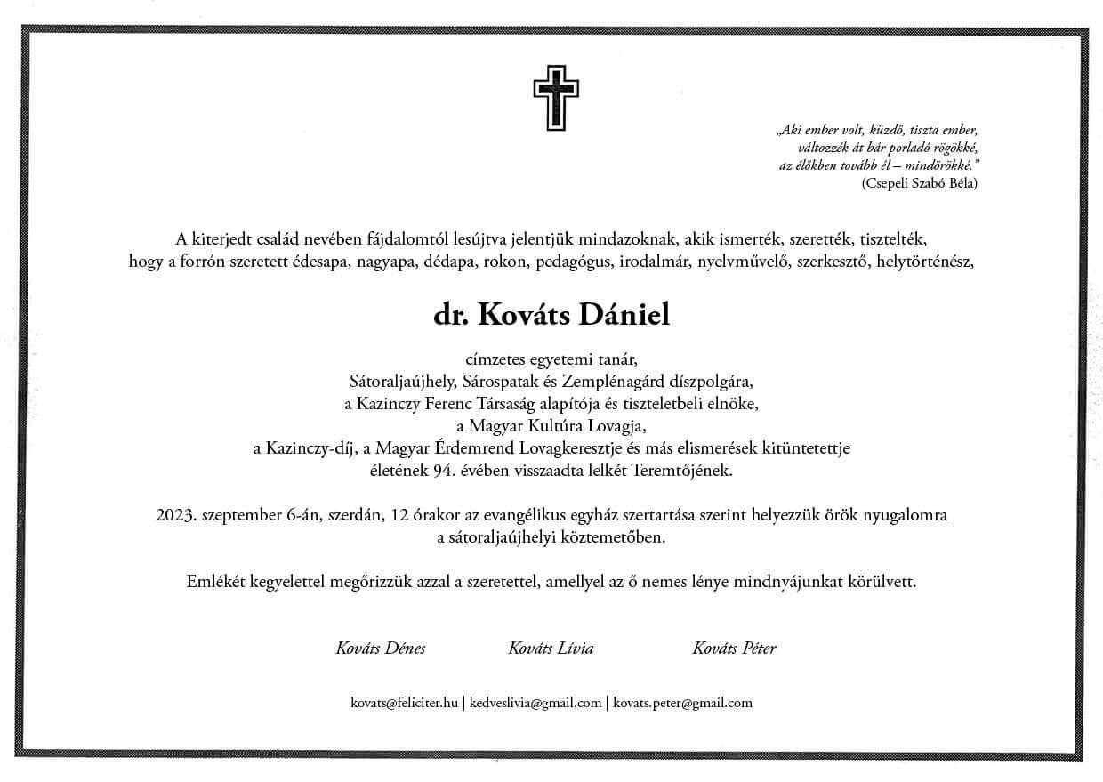 Mély fájdalommal tudatjuk, hogy életének 94. évében 2023. augusztus 30-án elhunyt Dr. Kováts Dániel, a sárospataki Comenius Tanítóképző Főiskola nyugalmazott főiskolai tanára, a Tokaj-Hegyalja Egyetem címzetes egyetemi tanára.Pedagógusi pályáját 1954-ben egy Miskolc melletti bányatelepen kezdte, majd Zemplénagárdon, egy általános iskolában tanított, innen a sátoraljaújhelyi Kossuth Lajos Gimnáziumba vezetett az útja. 1979-ben a debreceni egyetemen irodalomtudományból bölcsészdoktori oklevelet szerzett. 1974-től 1992-ig, nyugalomba vonulásáig a sárospataki Comenius Tanítóképző Főiskola tanára volt, két ciklusban főigazgató-helyettesként is tevékenykedett. 2021. szeptember 25-én, a Tokaj-Hegyalja Egyetem tanévnyitó ünnepi szenátusülésén címzetes egyetemi tanár kitüntető címet vehetett át.