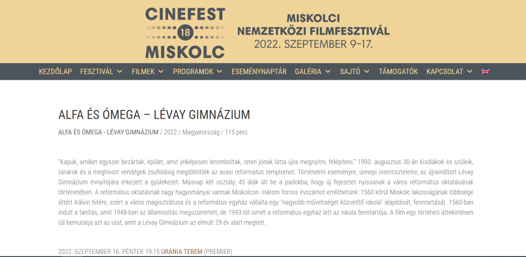 Szeptember 9-én kezdődött Miskolcon a nemzetközi hírű filmfesztivál, a 18. CineFest. A programban helyet kapott Kerényi László filmrendező vadonatúj munkája, az Alfa és ómega - Lévay Gimnázium című dokumentumfilm is.A dokumentumfilm kollégánknak, az Iskolavárosok Kutatóintézet vezetőjének, Ugrai Jánosnak, valamint óraadó munkatársunknak, Dienes Dénes professzornak a közreműködésével készült. Többek között munkatársaink mesélnek a régió oktatási kínálatát a 19. század közepétől mélyítő-gazdagító iskola történetéről. Az Alfa és ómegát szeptember 16-án mutatják be a fesztivál programjában.
