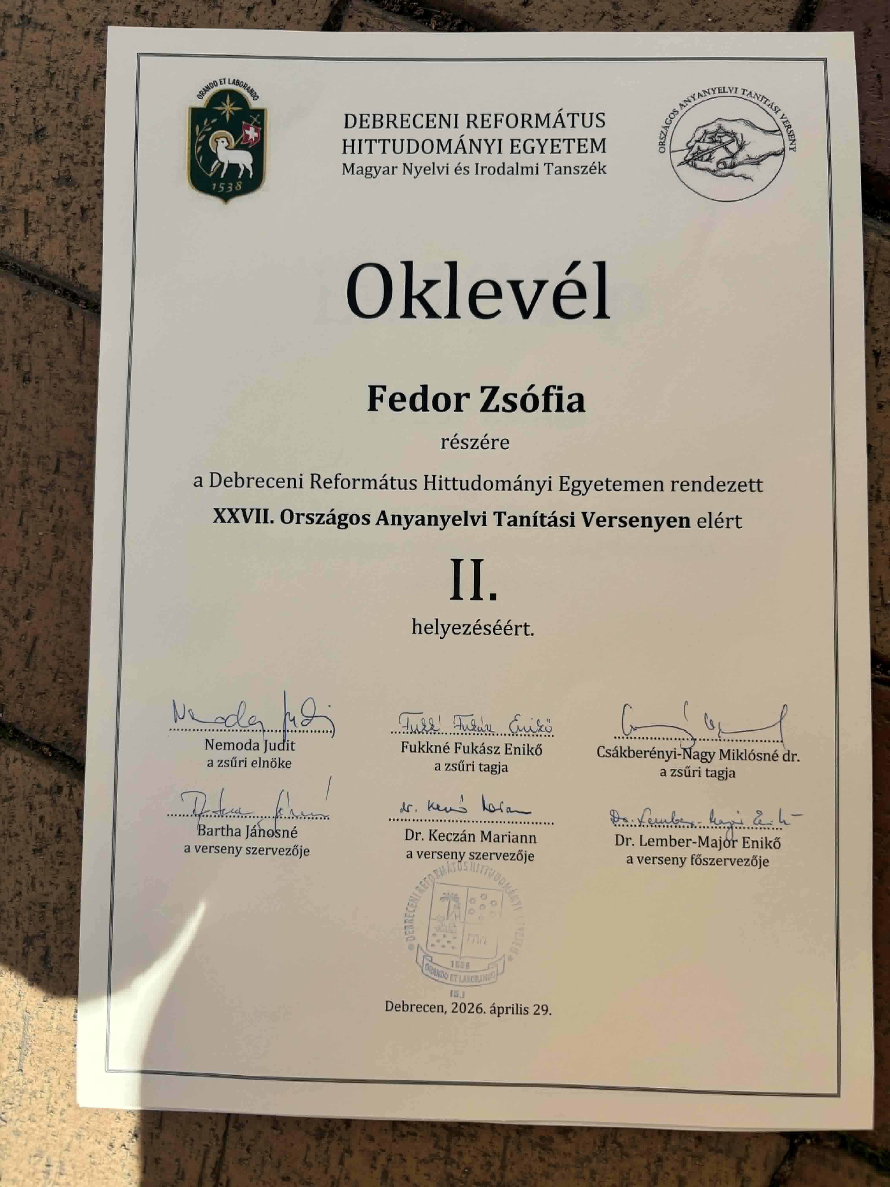 „Még most is nehéz szavakba önteni azt a rengeteg élményt, amit az elmúlt négy napban Debrecenben gyűjtöttem. A XXVII. Országos Anyanyelvi Tanítási Versenyre nemcsak egy megmérettetésként tekintettem, hanem egy olyan lehetőségként is, ahol végre élesben megmutathattam az anyanyelvem iránti szeretetemet és a pedagógiai elképzeléseimet. A Debreceni Református Hittudományi Egyetem patináns épülete és a város történelmi atmoszférája már az érkezésemkor megadta az esemény súlyát, és bár volt bennem egy egészséges izgalom, alig vártam, hogy bizonyíthassak.