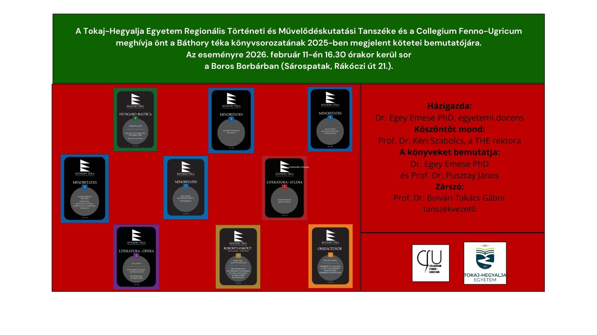 Az eseményt 2026. március 4-én, szerdán, 16 órakor tartjuk a Tokaj-Hegyalja Egyetem Dísztermében (Sárospatak, Eötvös u. 5., I. emelet), az alábbiak szerint: