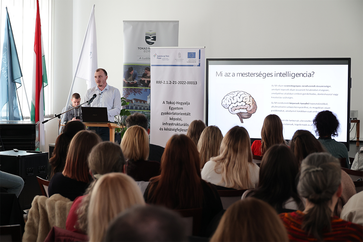 „A mesterséges intelligenciától a tantermi élményig” címmel rendeztek szakmai továbbképzést a Tokaj-Hegyalja Egyetemen 2026. február 24-én. A képzés az RRF-2.1.2-21-2022-00013 azonosító számú „A Tokaj-Hegyalja Egyetem gyakorlatorientált képzési, infrastrukturális- és készségfejlesztése” című projekt keretében, az Európai Unió támogatásával valósult meg, hozzájárulva az intézmény képzési és módszertani megújulásához. A programon a II. Rákóczi Ferenc Kárpátaljai Magyar Egyetem három oktatója – dr. Daróci Ádám, dr. Jakab Enikő és Papp Gabriella – tartott szakmai előadásokat. A programot Dr. Toma Kornélia rektori biztos nyitotta meg, aki szólt a két intézmény között nemrégiben hivatalosan is megerősített együttműködési megállapodás jelentőségéről.