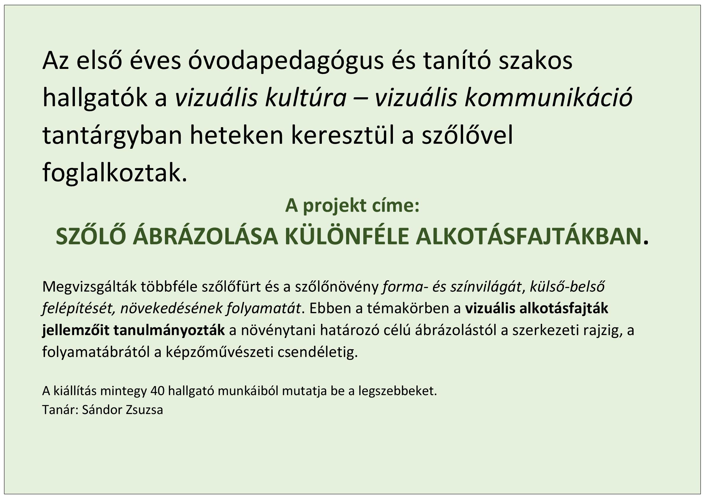 A hallgatók az őszi időszakban aktuális projekttémát dolgoztak fel: a szőlő és termése forma- és színvilágát, felépítését mutatják be különböző vizuális alkotásfajtákon keresztül. A mintegy negyven kiállított hallgatói munka között találunk ábrázolást, szerkezeti rajzot, folyamatábrát, képzőművészeti csendéletet. Az alkotások a vizuális kultúra órákon készültek Dr. Sándor Zsuzsa egyetemi docens szakmai irányításával. A téma kapcsolódott a 2022. november 13-15. között egyetemünkön megrendezett nemzetközi Tokaj Wine Congress tematikájához is.