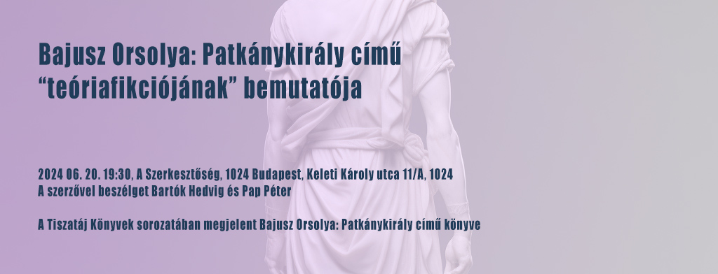 A Tiszatáj Könyvek sorozatában megjelent Bajusz Orsolya: Patkánykirály című könyve. Műfaja teória-fikció, és a műkritika, a művészetről való írás és elemzés formáinak kereséséről szól egy hálózatosodott világban.„A főhős fiktív, az alaphelyzet (formá...
