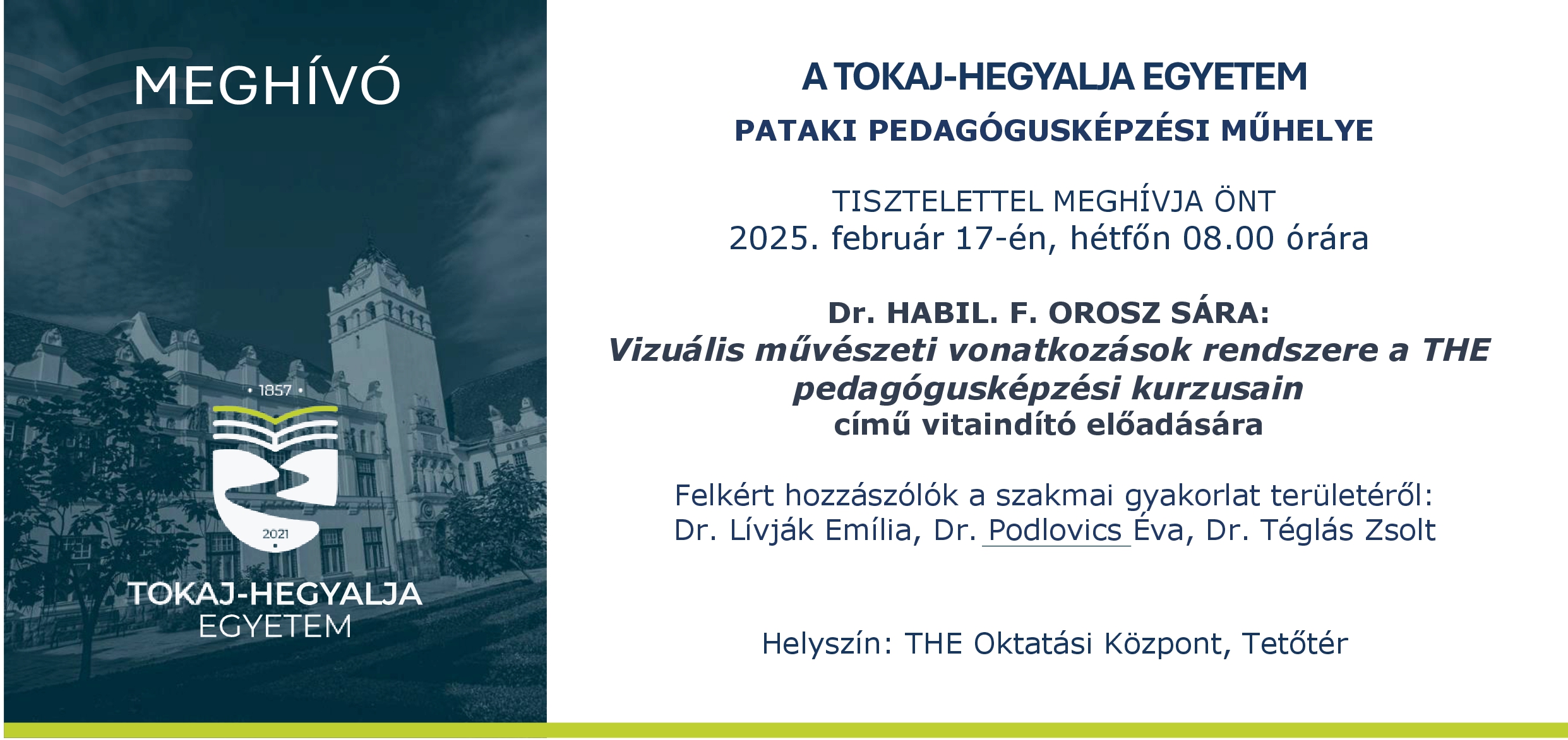 A TOKAJ-HEGYALJA EGYETEMPATAKI PEDAGÓGUSKÉPZÉSI MŰHELYETISZTELETTEL MEGHÍVJA ÖNT2025. február 17-én, hétfőn 08.00 óráraDr. HABIL. F. OROSZ SÁRA: Vizuális művészeti vonatkozások rendszere a THE pedagógusképzési kurzusain című vitaindító előa...