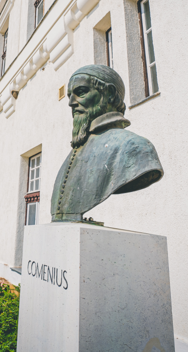 Az intézményt 1650-1654 között Sárospatakon tartózkodó, az oktatást megreformáló tudósról, Comeniusról nevezték el, akinek bronz mellszobrát, Pátzay Pál szobrász-művész alkotását először az Iskolakertben (1970), később a főiskola előtti téren helyezték el. A főiskola belső udvarán, a kollégium mellett látható Ispánky József: Pedagógus nő című egész alakos szobra, melyet 1954-ben avattak fel. Szintén a belső udvaron látható a főiskola tudós tanárának, Ködöböcz Józsefnek bronz mellszobra, Borsos István szobrászművész alkotása, melynek avatása 2004-ben történt.