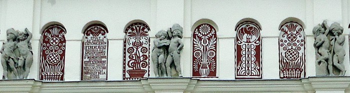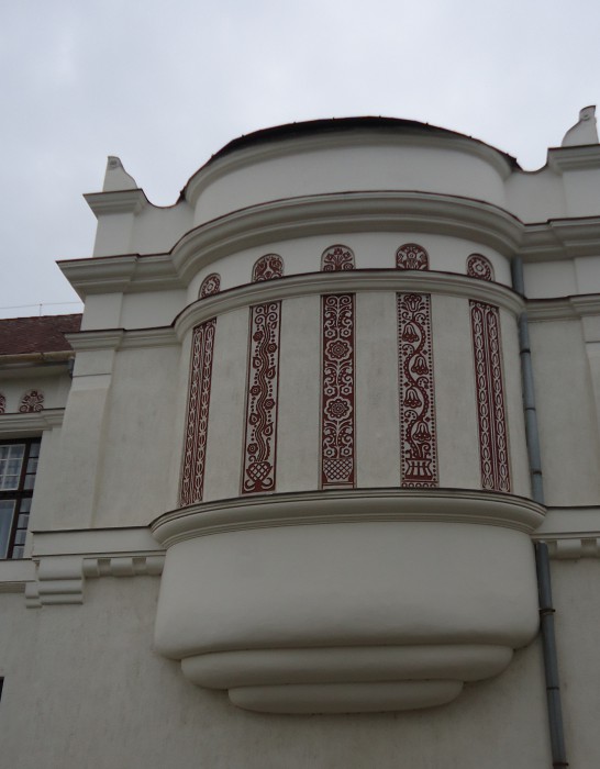 Ugyanígy felismerhető a Felső-Magyarországra jellemző pártázatos, sgrafittókkal díszített épületek hatása is, melyekben a népművészeti formaelemek (stilizált virág ornamentika) sajátosan ötvöződnek a pártázaton, illetve az épület más pontján megjelenő faldíszítményekkel (pl. a pilasztereken lévő gyermekfigurákkal, vagy a bejárati kapu díszítő elemeivel).