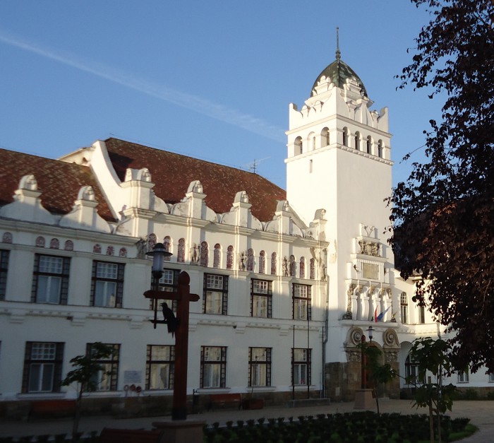 A volutával képzett pártázat körbefutva összefogja, és mintegy „megkoronázza” az épületet. A kiemelkedő torony hasonló elemekből (dupla pártázat, boglyakupola) épül, az attika pedig az épület legrangosabb helyszínét, a fa kazettás, virágmintákkal díszített mennyezetű dísztermet hangsúlyozza.